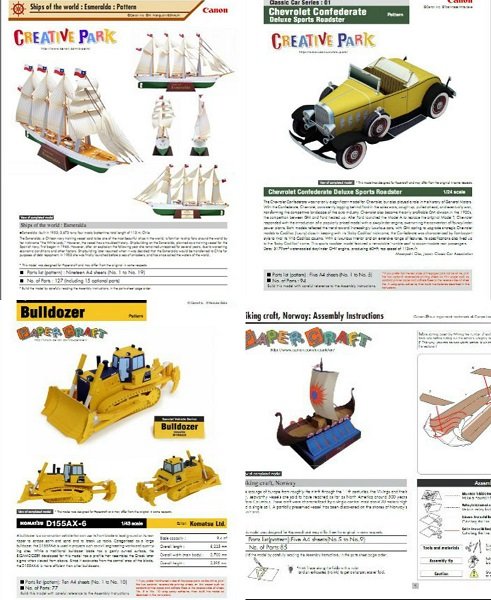 Подборка 56 бумажных моделей современной техники (самолеты, автомобили, парусники, экскаваторы и т.д.). Все что вам нужно сделать - это распечатать на листе А4 выбранный pdf и приступить к вырезанию, сгибанию, склейке и сборке очередной фигурки.